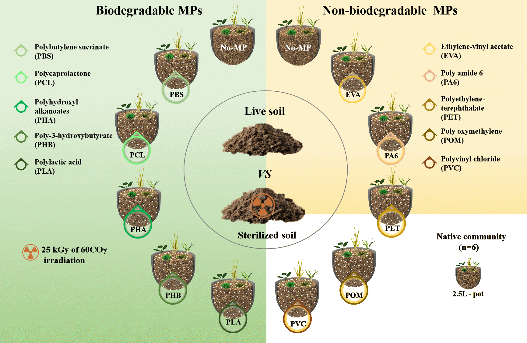 可生物降解塑料被视为替代传统塑料以缓解土壤塑料污染的绿色替代品,但它们可能比传统塑料更快地分解为微塑料,进而对陆地生态系统特别是植物生态系统构成额外威胁。同时,微塑料被认为会破坏植物土壤生物的相互作用,使植物生长受到影响。当前,研究聚焦于个体植物层面,却鲜有关于微塑料对植物群落多样性和生产力方面的潜在影响的报道。因此,微塑料对植物群落造成的生态后果尚不清楚。