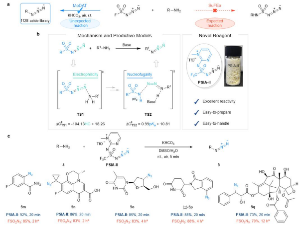 (a)氟磺酰叠氮对伯胺进行模块化重氮转移的意外发现;(b)重氮转移反应的活性预测模型和新型重氮转移试剂;(c)PSIA-II试剂用于天然产物和药物的快速修饰