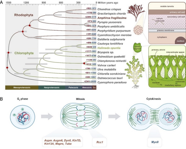 两种钙化藻类系统演化与仙掌藻核分裂图示