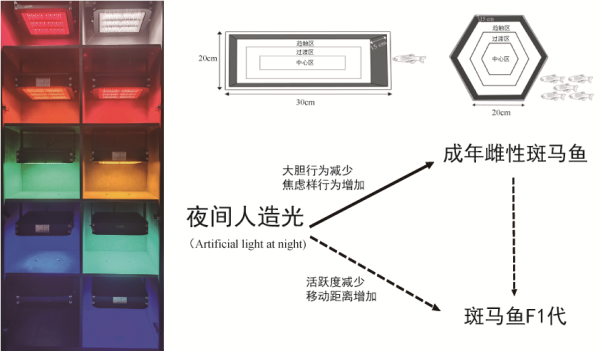 夜间人造光是现代城市环境中常见的光污染源。渔业生产的精准捕捞和养殖环境营造、水电环保的过鱼设施灯光诱趋鱼、水域沿岸城市的灯光秀和街道照明等,均属于夜间人造光范畴。夜间人造光的光谱组成与自然光源不同。随着LED等现代照明技术的普及,夜间人造光光谱范围更广泛,对自然环境的影响更深远。既往研究表明,夜间人造光会扰乱陆生生物的昼夜节律,但水生脊椎动物影响及其代际效应尚不清楚。斑马鱼作为广泛应用的模式生物,具有高度敏感的光感受器,是研究光污染影响的理想对象。
