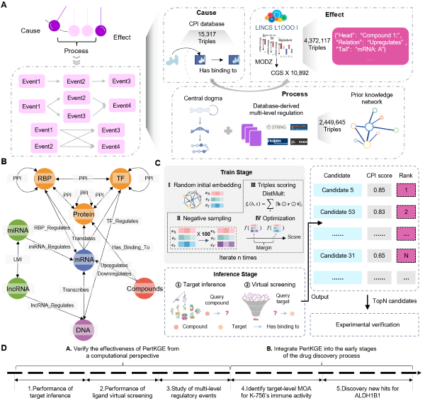 该研究提出了基于知识图谱的PertKGE模型。PertKGE模型受启发于微扰组学分析中的因果推断模型以及知识图谱在药物发现中的应用,从因果视角来构建新型的生物知识图谱,包含原因部分(化合物与受试体中的特定靶标发生CPI)、过程部分(生物系统中多层级的调控事件对CPI信号进行放大)、结果部分(微扰结果以差异表达基因的形式被观测)。在此基础上,研究结合知识图谱嵌入技术来建模因果链接,以达到从差异表达基因中解耦CPI的目的。广泛的计算实验表明,PertKGE在化合物冷启动和靶标冷启动场景中均取得了优异的CPI预测性能,同时,PertKGE通过因果策略引入的多级调控事件缓解了CPI数据集中代表性偏差对模型学习的影响,从而提高了预测的可靠性。