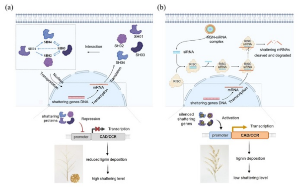 为解决这一难题,该团队转而利用纳米技术开展研究。科研人员使用介孔二氧化硅纳米颗粒(MSNs)作为载体,将小干扰RNA(siRNA)传递到高秆野生稻的细胞中。研究显示,siRNA可以特异性地沉默与种子脱落相关的基因,而不对植物的其他功能产生永久性影响。