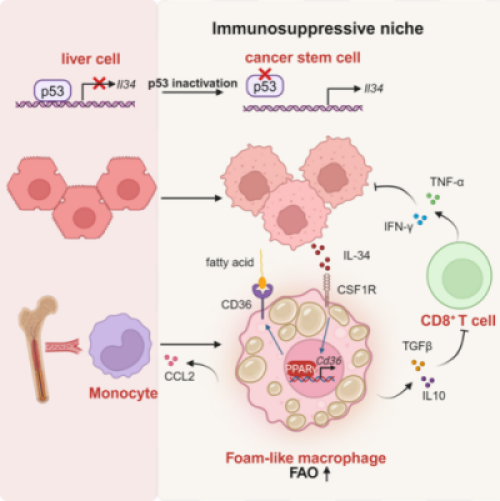 中国科学技术大学生命科学与医学部免疫调节与免疫治疗重点实验室教授魏海明课题组发现,p53可以直接调控免疫细胞的发育、分化与功能,并在肿瘤免疫微环境中发挥重要作用。p53突变导致肿瘤干细胞分泌白细胞介素34,而白细胞介素34进一步代谢重编程肿瘤相关巨噬细胞,并抑制CD8T细胞的抗肿瘤免疫。