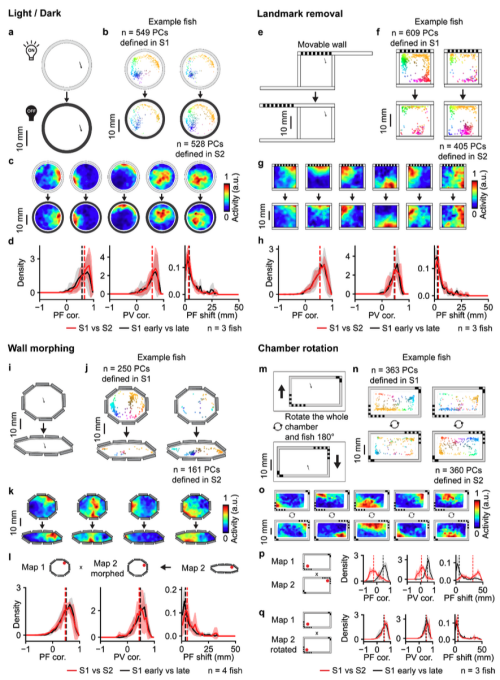 该研究通过系统性地改变外界环境发现,斑马鱼大脑中编码空间信息的神经元网络可能同时集成了类似于哺乳动物位置细胞的异位和自位信息。这些空间信息编码神经元显示出组装结构的特性,这与哺乳动物中关于位置细胞之间的相关性比之前预期的要强的发现相符。
