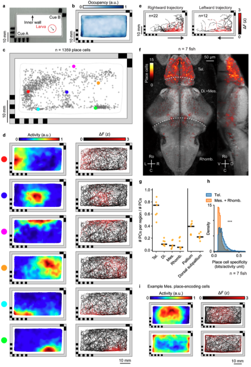 该团队对自由游动幼年斑马鱼进行了全脑成像,发现了微小幼虫斑马鱼大脑存在位置细胞的证据,揭示了硬骨鱼脑中空间信息的功能特性和解剖分布。与编码方向和速度的细胞相比,多数位置细胞位于斑马鱼前脑中端脑区域,但其确切功能是争论的焦点。端脑中位置细胞的高浓度或证实了长期以来的猜想,即该大脑区域是缩小的哺乳动物海马体的功能类似物。这些位置编码神经元可以用来解码动物随时间变化的空间位置。通过将这一群体编码投射到二维活动流形上,研究观察到斑马鱼大脑中空间表示随时间的演变。