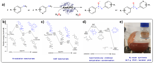 进一步,通过分子动力学模拟及量子化学计算等方法,该团队提出了过氧合酶催化合成的氧化偶氮分子的反应机理。过氧合酶与苯胺化合物结合,通过N-氧化机制生成羟胺,进而通过两个HAT生成亚硝基苯。两个中间体即苯羟胺和亚硝基苯自发脱水缩合生成氧化偶氮苯,且势垒仅为15.7Kal/mol。该研究发展了新型分子合成方法,对丰富血红素类氧化酶的理论与技术方法具有重要意义。