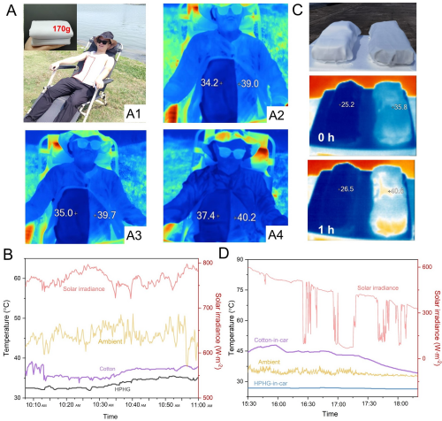 科研人员将HPHG10与传统商业棉织物结合制成背心,并在炎热夏季进行1小时实验。热成像仪显示,1小时后,HPHG10温度比棉背心低2.8°C,且HPHG10与人体皮肤间温度维持在舒适的36°C。除了可穿戴冷却性能出色,HPHG10还可用于空间冷却,如汽车被动日间冷却。在约2小时阳光直射实验中,HPHG10覆盖的汽车模型内部最高温度分别比无覆盖和棉覆盖的汽车模型低32.1°C和21.1°C。在库木塔格沙漠,HPHG可以将沙子的表面温度降低29.7°C。