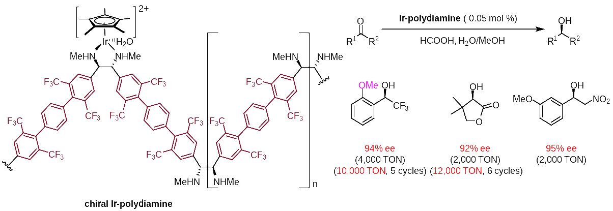 无码影片 上海有机化学研究所汤文军课题组基于前期在双硼介导[3,3]-σ重排方面的研究工作,针对可工业化、具有高转化数的不对称催化反应,通过双硼介导的不对称还原偶联得到了一系列新型手性聚合二胺配体,并制备出相应的铱催化剂。该类高效、可循环使用的铱催化剂在众多官能团化酮的不对称转移氢化中表现出优异的对映选择性和总转化数,展现出工业应用前景。