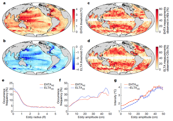 该研究分析了位于全球不同海盆、最长观测时间超过15年的8套长期潜标资料,发现了超过80%的次表层热浪/冷浪事件与表层热浪/冷浪没有直接关联。它们之中约有一半发生于反气旋涡/气旋涡经过期间。这一比例高于对应涡旋的发生频率,且强度越大的事件发生于涡内的比例越高。这表明,与海气热交换等表层极端事件的主导机制不同,涡旋在驱动次表层热浪/冷浪中起到关键作用。