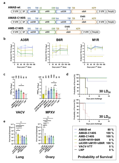 高福和王奇慧团队基于结构生物学指导的疫苗研发平台,创新性地设计出嵌合三价mRNA疫苗。该疫苗在小鼠中可诱导出高效的体液免疫与细胞免疫,维持抗体水平在免疫近6个月后基本不变,实现了致死剂量痘苗病毒攻毒后对小鼠的完全保护,并可在猴痘病毒攻毒后降低小鼠多个器官中的病毒载量。相比之下,同样痘苗病毒剂量下,接种痘苗天坛株减毒活疫苗的小鼠全部死亡。