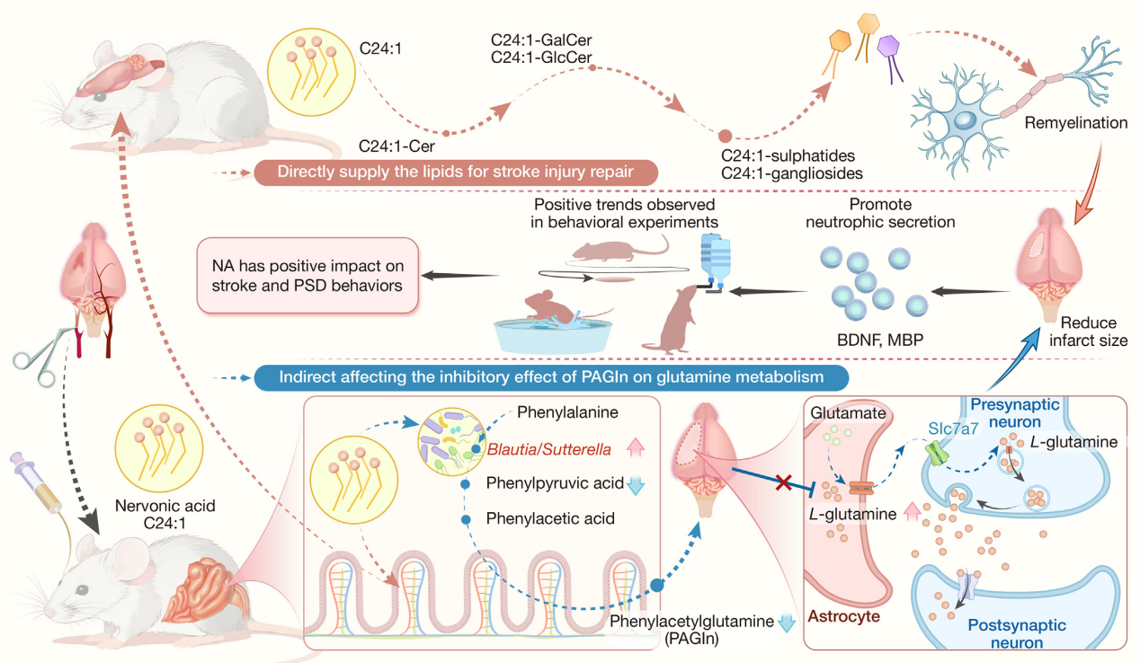 在作用机制方面,神经酸的补充能够直接补充脑内神经酸,同时,神经酸组能够改善肠道菌群多样性,增加与苯丙氨酸代谢相关的Blautia和Sutterella菌群丰度。血浆和脑样本的代谢组学显示,苯丙氨酸和谷氨酸水平降低减轻了对谷氨酰胺代谢的抑制作用,促进了卒中后神经元的恢复和信号传递,并在一定程度上抑制了卒中后抑郁的产生。