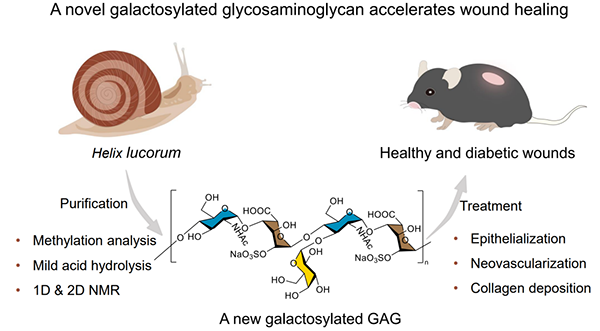 该团队报道了新型半乳糖基化糖胺聚糖,丰富了糖胺聚糖的结构类型。同时,这一新型糖胺聚糖具有促进伤口愈合的活性,为研发糖尿病足溃疡治疗药物奠定了药理基础。
