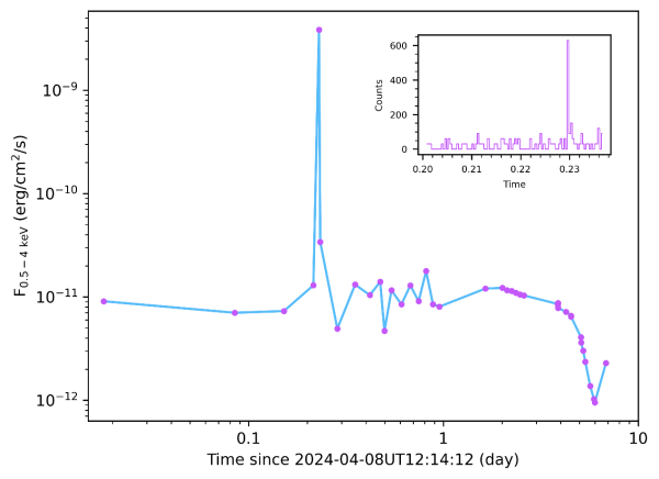 “天关”首篇正式发表的科学论文报道发现的暂现天体EP240408a的X射线辐射强度随时间的变化曲线