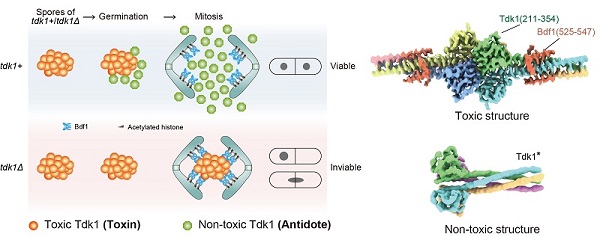 裂殖酵母主要以单倍体形式进行无性繁殖,但在饥饿情况下可以进行有性繁殖。在有性繁殖期间,不同性别的单倍体细胞融合形成双倍体,进而经过减数分裂形成四个单倍体孢子。在营养生长和减数分裂期间,Tdk1蛋白质形成无毒性的四聚体结构。而在孢子中,Tdk1靠近羧基的区域会转变为毒性的六聚体构象,并与乙酰化组蛋白阅读器Bdf1结合。同时,毒性Tdk1能够形成超分子聚合体,在有丝分裂过程中阻止染色体的分离,杀死不携带tdk1基因的孢子。而在携带tdk1基因的孢子中,萌发过程中新合成的Tdk1可以拆解这些有毒的超分子聚合体,从而发挥解毒药的作用。