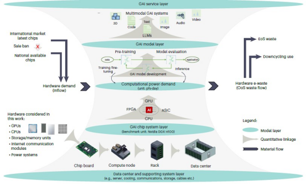 当前,以大语言模型为基础的生成式人工智能正在快速发展,并走进日常生产与生活。然而,生成式人工智能需要庞大的计算算力与硬件资源,以支撑大模型的训练和推理。因此,围绕生成式人工智能的硬件需求分析及其资源环境影响评估成为国际可持续发展领域的前沿挑战。然而,鲜有关于生成式人工智能对于电子废弃物的影响及管理策略举措的研究。