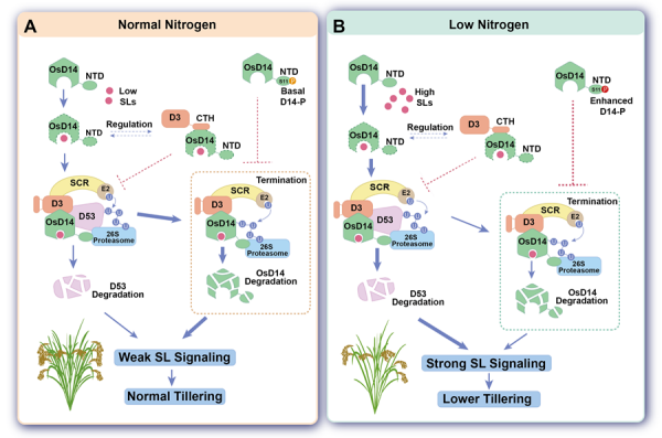 该研究结合已有成果提出,低氮环境一方面通过诱导独脚金内酯合成增强信号感知,另一方面通过促进D14的磷酸化抑制蛋白降解进而降低独脚金内酯信号感受的终止。两种机制协同增强了独脚金内酯途径的功能,实现了对分蘖数目的抑制。