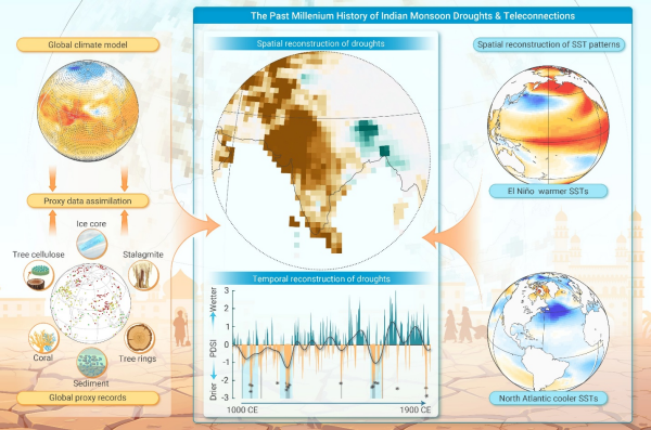 有研究揭示了厄尔尼诺现象与现代印度夏季风(ISM)干旱的关系。也有研究和观测显示,即使在非厄尔尼诺年份,ISM的随机变率可能导致印度次大陆遭遇干旱。而受限于观测资料的时间长度,非厄尔尼诺年导致ISM衰退的具体机制不甚清楚。特别是,历史记录显示过去千年中曾出现多个持续十年至数十年的严重ISM干旱事件,这在仪器测量记录中前所未见。这些大规模干旱是否是ISM的固有特征以及它们背后的物理机制及与厄尔尼诺-南方涛动关系的稳健性,有待进一步探究。
