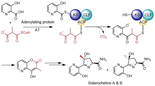 络铁菌素生物合成途径中新型II型聚酮合酶催化的二酮单元形成