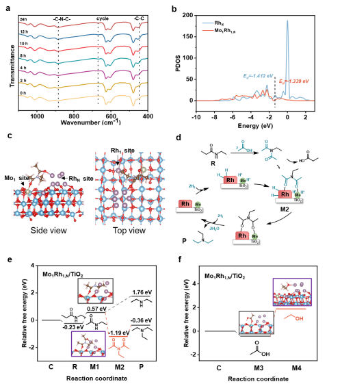 无码影片 化学研究所刘志敏课题组等围绕退役塑料的化学回收利用,发展了多个新的聚酯/尼龙等塑料降解转化方法,在实现其解聚转化的同时为化学品合成提供了新思路。近期,该课题组提出了酸解与加氢耦合实现尼龙解聚转化制备羧酸和叔胺的新策略。该课题组设计合成了Mo单原子与Rh纳米颗粒协同作用的催化剂Mo1Rh1,N/TiO2。在温和条件下,这一催化剂可催化尼龙的乙酸解聚,生成相应的羧酸和二酰胺中间体,并进一步催化二酰胺加氢生成叔胺,以100%的选择性将各种尼龙转化为相应的羧酸和叔胺产物。研究显示,Mo单原子与Rh颗粒通过金属-金属相互作用,产生有效的Mo/Rh活性中心,通过强配位能力选择性活化二乙酰胺中间体;Rh颗粒活化H2,形成氢溢流环境,为Mo和Rh原子上吸附的酰胺键提供活性H,实现二酰胺加氢生成叔胺产物,从而有效抑制羧酸加氢。