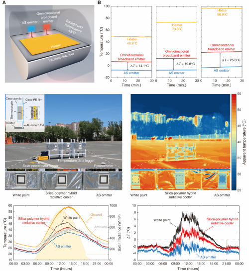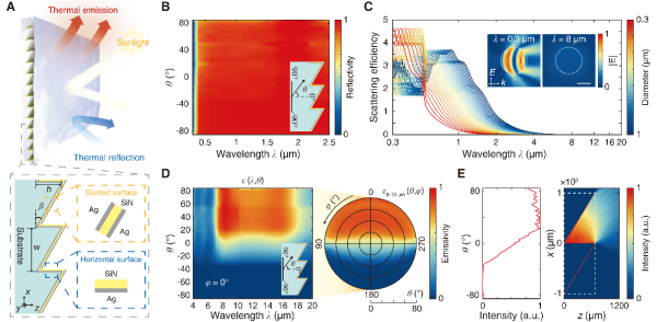 该研究从太阳反射率、大气透明窗口内的光谱选择性、热辐射角度非对称特性协同设计,以热力学、互易性、波导和声子激化共振等理论为基础,利用跨尺度对称破缺结构实现了热辐射在空间角度上的非对称分布以及在光谱上的选择性调控。
