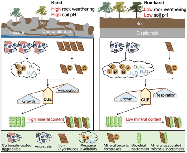该团队以渝黔桂典型水热梯度样带为研究区,以喀斯特和非喀斯特相同林龄的次生林土壤为研究对象,量化原状土壤和破碎团聚体土壤微生物碳利用效率,阐明微生物残体在不同稳定态有机质组分中的分配赋存特征。结果表明:破碎团聚体提高了喀斯特和非喀斯特土壤微生物碳利用效率;喀斯特土壤高钙和高铁氧化物含量增强了大团聚体稳定性和矿物保护能力,降低了微生物碳利用效率;尽管土壤团聚体稳定性和矿物保护降低了微生物碳利用效率和微生物残体生成量,但矿物保护增强了微生物残体稳定性;土壤团聚体和矿物对土壤有机碳形成和稳定的权衡效应受岩性调控,而喀斯特土壤高矿物含量导致更高的权衡效应。