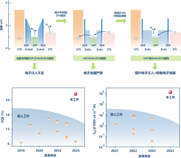 近日,樊逢佳与河南大学教授申怀彬再次合作,利用EETA技术探讨了绿色磷化铟基量子点发光二极管的关键科学问题。研究表明,当前绿色磷化铟基量子点LED性能较低的主要原因在于电子注入不足和严重的电子泄漏。为此,研究提出了采用“低、宽势垒”的设计方案。这一方案既提升了电子注入效率,又有效抑制了漏电现象。通过这一优化,研究实现了绿色磷化铟基量子点LED的峰值外量子效率达26.68%,亮度突破270,000cd/m2,并在初始亮度1,000cd/m2下T95(亮度衰减到起始值的95%)寿命达1,241小时,刷新了世界纪录。