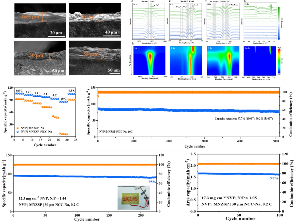 实验结果表明,对称电池实现3.5mA cm−2的高临界电流密度和0.2mA cm−2下6000 h的长循环寿命。同时,匹配Na3V2(PO4)3正极的全电池在10C下经历5100次循环后展现出90.2%的高容量保持率,且使用有限钠金属负极与高面载量(17.3mg cm−2)的Na3V2(PO4)3正极组装的固态钠电池,在N/P比低至1.05的条件下,循环100次后的容量保持率高达97%。