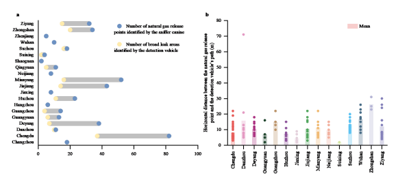 这一技术已在全国20个城市约4000公里燃气管网系统中得到应用。结果表明,在车载系统识别的220个泄漏区域内,嗅探犬精确定位了432个天然气释放点。该技术最远可探测距离车辆行驶路线71米的天然气泄漏点,优于传统方法。这项研究为城市燃气管网安全管理提供了创新型技术,并为光学-生物协同检测在其他领域的应用提供了新思路。