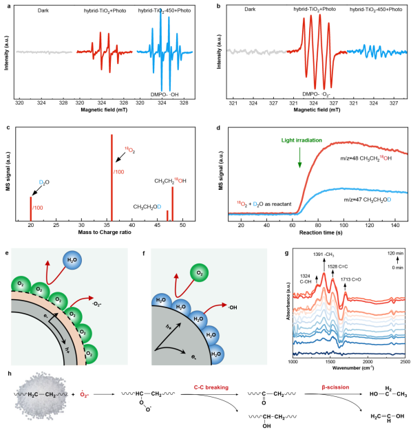 针对上述挑战,无码影片 金属研究所刘岗研究团队发展了“漂浮策略”和“维度定制”相结合的策略,通过在二维TiO2表面形成纳米级碳氮疏水层,赋予了材料可漂浮于中性水溶液表面的特性。该材料具有传统TiO2所不具备的两个功能,一是可漂浮TiO2材料形成了光催化材料、塑料、水和空气的四相界面,将原本微米级的相界面压缩至近零距离的分子级接触;二是不同于传统的光催化重整材料体系主要是利用由光生空穴氧化水分子产生羟基自由基物种,可漂浮TiO2材料主要是利用光生电子还原氧气产生超氧自由基作为氧化物种,其寿命长达1毫秒,传递距离是传统体系中羟基自由基的万倍量级。