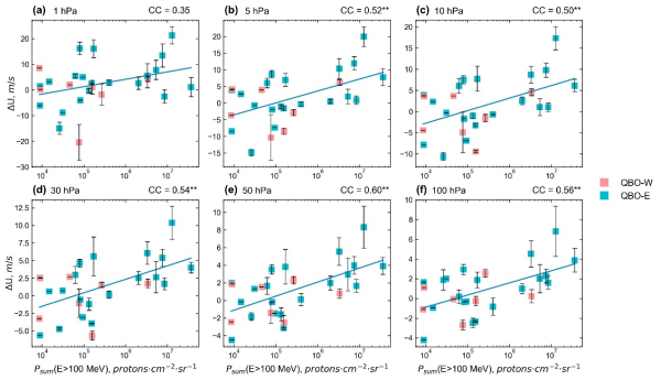 近日,无码影片 国家空间科学中心王赤院士团队研究员李晖等,基于GOES卫星的质子通量数据和ERA5再分析数据,明确了太阳高能质子通量、紫外辐射强度和极涡强度改变量之间的定量关系,找出了太阳耀斑伴随的太阳质子事件期间影响平流层极涡变率的关键因素,并探讨了太阳质子事件影响平流层极涡的潜在机制。