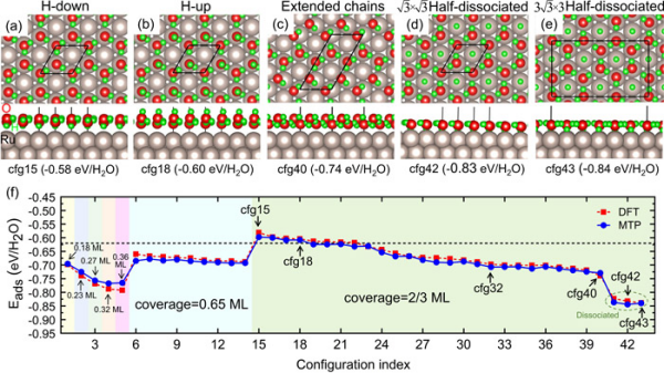 水在固体表面的吸附与解离行为直接影响着材料表面的稳定性、腐蚀防护、光催化水分解和电化学制氢等诸多关键过程。然而,由于固-水界面相互作用以及水中氢键网络的相互竞争,导致金属表面的水分子构型十分复杂。比如,金属钌表面的水是以分子态吸附还是解离态存在,学术界长期存在争议。实验手段因受限于时空分辨率,难以捕捉水的动态构型,导致部分结果支持金属钌表面水以分子态吸附,而另一些实验则支持水以解离态吸附。