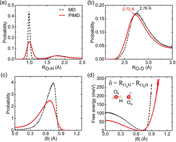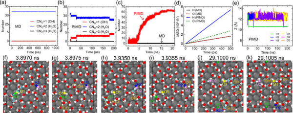 研究团队利用该计算工具,通过路径积分分子动力学模拟,首次在亚微秒(几百纳秒)时间尺度上模拟揭示了氢质子量子隧穿的动态过程,不仅捕捉到氢原子的量子离域特性,还揭示了金属钌(0001)表面水分子通过量子协同机制分解为氢离子(H+)和氢氧根离子(OH-)的完整路径,在原子尺度模拟实现了水分子在核量子效应驱动下的解离现象,为金属钌表面水分子分解提供了科学依据,解决了领域内的这一长期争议。
