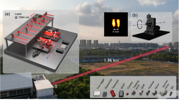 针对上述难题,该团队创新性地提出了主动光学强度干涉技术,开发了多激光发射器阵列系统,通过大气湍流的自然调制,巧妙地合成多个相位独立的激光束以实现远距离赝热照明。如下图所示,在1.36公里城市大气链路外场实验中,团队使用8个相互独立的激光发射器来构建发射阵列照射目标。相邻发射器间距为0.15米,大于大气湍流的典型外尺度(通常为0.02米至0.05米),以确保每束激光在经过大气传播后具有独立且随机的相位变化。同时,构建的接收系统由两台可移动的望远镜组成0.07米至0.87米的干涉基线,结合高灵敏度的单光子探测器以测量目标反射光场的强度关联信息。同时,团队还开发了鲁棒的图像恢复算法,重建出具有毫米级分辨率的目标图像。