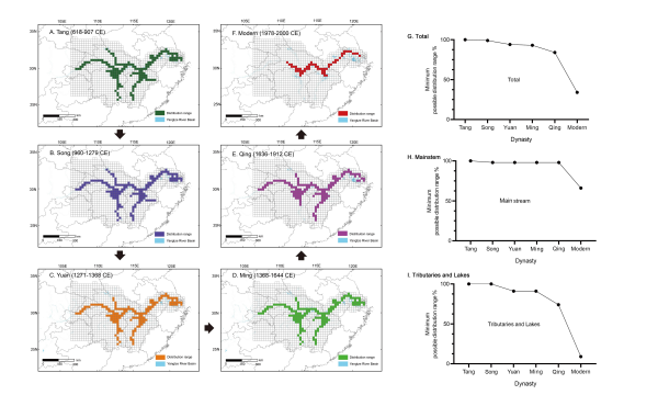 结果显示,记录长江江豚的网格数量由唐朝的169个减少至现代的59个,分布范围整体减少了65%。特别是在清朝(142个网格)至现代(59个网格)这段期间,长江江豚分布发生了显著下降,凸显了过去一个世纪内栖息地范围的急剧收缩趋势。具体区域收缩程度存在差异:在长江干流,江豚分布范围从唐朝到现代缩小了33%;但在支流和湖泊中,范围则减少了高达91%。