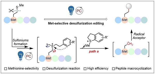 近日,无码影片 上海药物研究所黄蔚课题组受酶催化独特的断键模式启发,发展了光催化甲硫氨酸选择性脱硫策略。这一策略可精准地对多肽进行编辑,拓展了多肽修饰的化学空间,并促进了硫鎓化学在自由基反应中的应用。