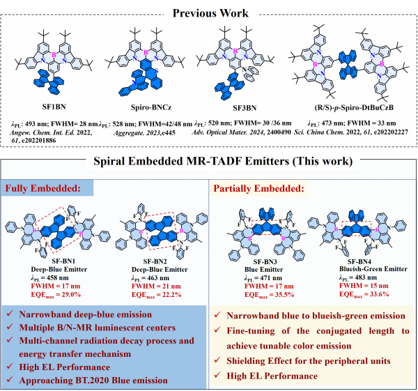 对于完全嵌入 B/N-MR 核心的发光体SF-BN1和SF-BN2,SF中的sp3杂化碳原子将每个分子分成对称的部分,形成两个独立且刚性的B/N-MR 发光中心。这阻碍了共轭结构,降低了共轭长度,发射出深蓝光,并通过多通道辐射衰减过程和能量转移机制显著提高了材料效率。对于部分嵌入B/N-MR 核心的发光体SF-BN3 和 SF-BN4,芴嵌入的 B/N-MR 核心可以连接B/N2[4]螺旋烯亚单元,形成刚性分子框架。