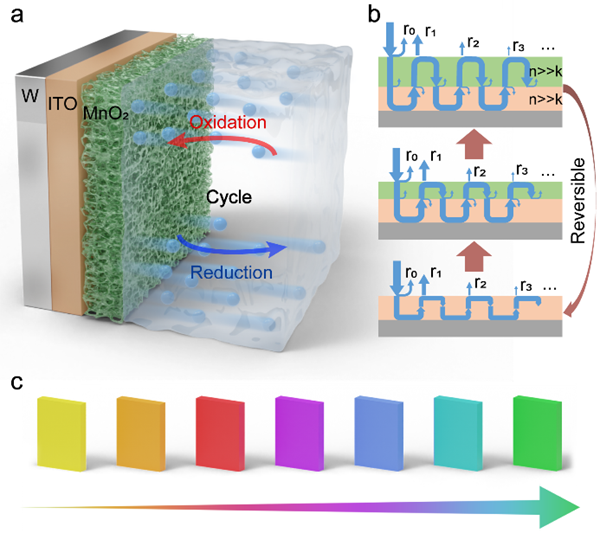 无码影片 苏州纳米技术与纳米仿生研究所研究员赵志刚团队通过电致变色电极表面的原位电驱动光学谐振腔重构技术,研制出具有宽谱可调特性的新型电致变色器件。该方法制备的器件可在单一器件中实现从黄色、橙色、红色、紫色、蓝色、青色到绿色等多种颜色转变,几乎覆盖整个可见光谱。除超宽色调可调性外,器件还具有工作电压窗口小、优异的双稳态保持性、极低功耗以及良好的循环稳定性等优点。