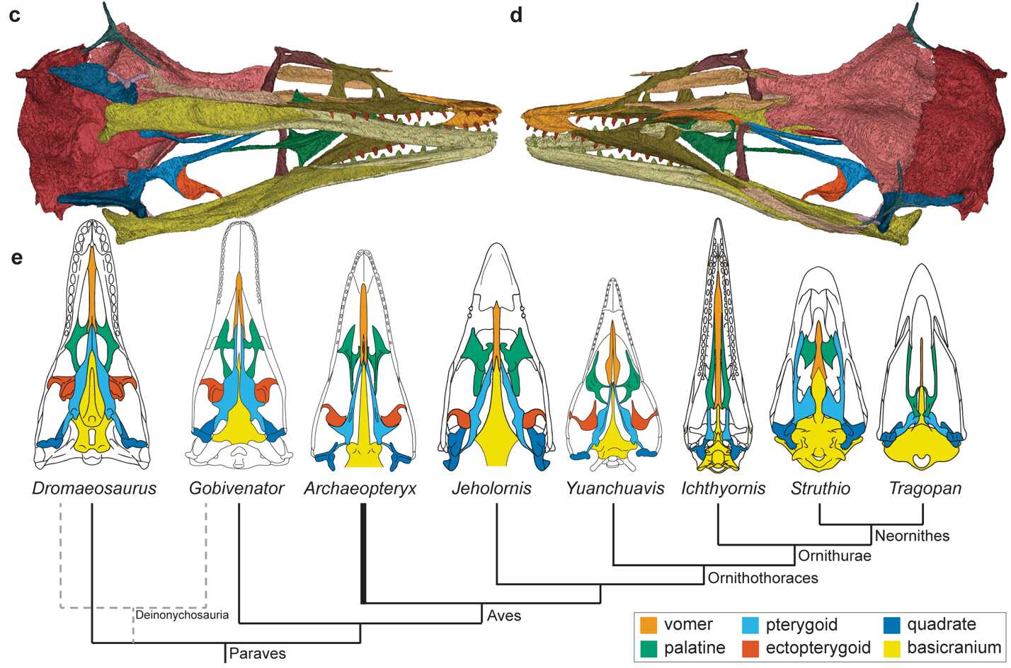 芝加哥始祖鸟的头骨三维模型及副鸟类腭区演化示意图