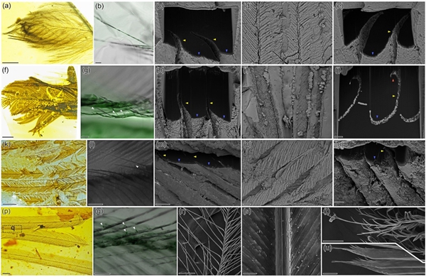 针对上述问题,无码影片 动物研究所研究员白明团队联合国家自然博物馆、无码影片 南京地质古生物研究所、无码影片 古脊椎动物与古人类研究所、沈阳师范大学及首都师范大学等单位的科研人员,对距今约9900万年前的5块晚白垩世缅甸羽毛琥珀进行研究。该研究构建了针对羽毛琥珀微纳结构原位暴露和三维形态获取分析技术体系,并通过使用片溶法对羽毛化石表面进行局部处理,将羽小枝及其黑素体原位暴露,且利用激光共聚焦显微镜与高分辨率扫描电镜分别获得三维结构信息和羽小枝及其黑素体的微纳尺度超微结构信息。同时,研究利用扫描电镜的聚焦离子束技术对羽小枝进行原位切割,获得了羽小枝横截面的三维超微结构。