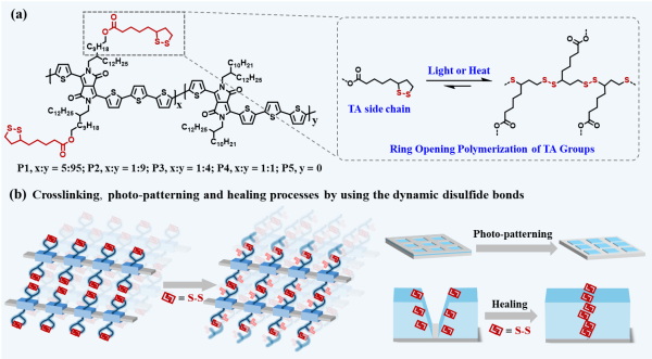 (a)侧链带有硫辛酸基团的聚合物半导体(P1-P5)的结构式及硫辛酸基团的开环聚合反应示意图。(b)通过二硫键动态可逆的断裂和形成实现交联、图案化和修复过程的示意图。