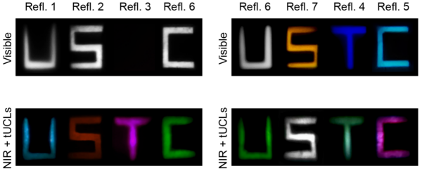 各种图形(不同反射波谱的反射镜片模拟)通过tUCLs内置的可穿戴式框架眼镜系统在可见光和近红外光照射下的色彩显示