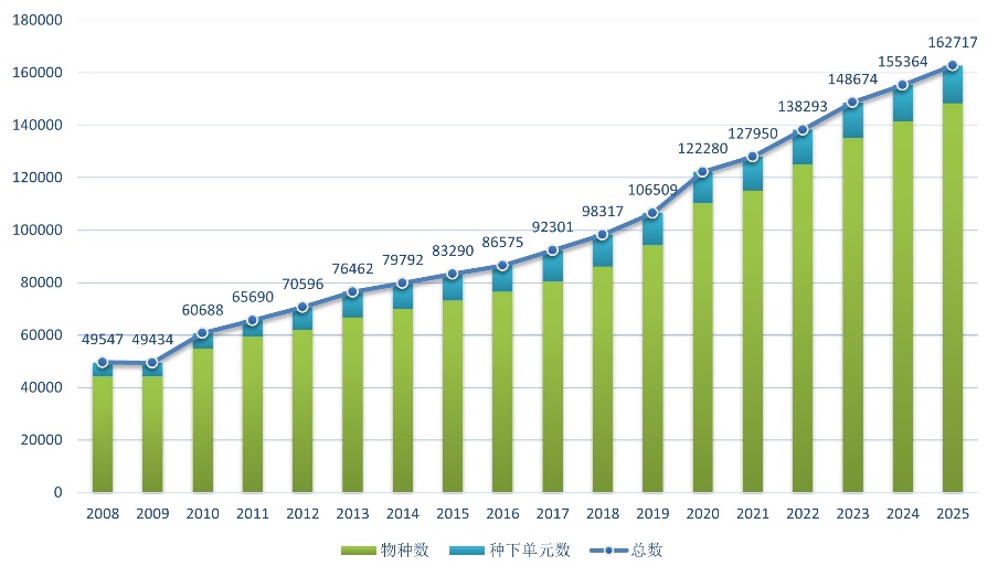 2025版名录共收录物种及种下单元162,717个,其中物种148,341个,种下单元14,376个。较2024版新增6,857个物种和496个种下单元,动物界新增4,994个物种和470个种下单元,植物界新增458个物种,减少5个种下单元,真菌界新增1,405个物种和31个种下单元。2025版名录实现了与全球生物物种名录互通互补,新增中国竹节虫目515个物种及种下单元,进一步推动国际科学数据合作;首次收录了中国蜻蜓和蚯蚓,分别新增了895和405个物种及种下单元,填补这两个动物类群的空白。