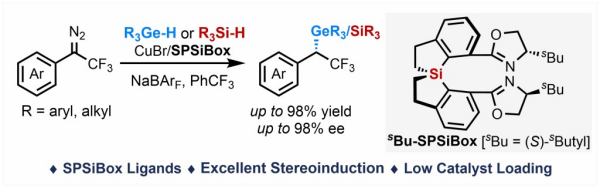 研究利用铜催化剂和新型SPSiBox配体实现了高效、高对映选择性的有机锗和有机硅化合物合成。该方法条件温和、催化剂载量低,具有广泛的底物适用性,为合成含锗的多功能分子提供了新途径,并为理解铜催化卡宾Ge−H插入反应的机理提供了理论支持。