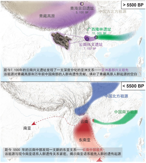 该团队首次通过基因组数据发现,云南中部距今5500年至1400年的人群携带一种迄今未被识别的独特东亚祖源,且不同于东亚北方或南方人群。团队将其命名为云南中部祖先人群,并发现这一祖源与当今南亚语系人群密切相关,表明云南可能是南亚语系族群的早期核心区域之一。