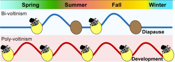 昆虫是地球上分布最广的动物类群。为适应不同地域和气候条件,昆虫需要有效的季节性适应策略如迁飞、滞育等以及合理的年度生活史即每年发生代数,以躲避或应对低温、短光照、食物匮乏等不利环境。昆虫滞育是在特定时期或在特定环境信号的诱导下发生的发育停滞行为,并伴随生理、代谢、表型等方面的变化。滞育帮助昆虫应对不利环境并延长其世代周期,是昆虫种群在不同气候条件下维持相应年度生活史的生理基础。昆虫种类众多,滞育形式各异。目前,具体的滞育和化性变异机制只在模式昆虫-果蝇中得到部分解析。