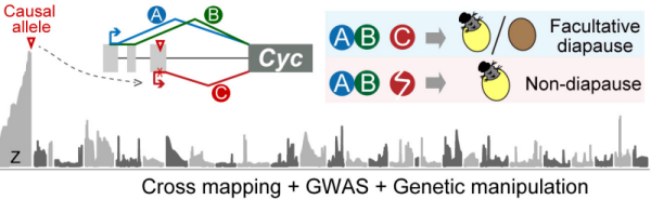 研究思路:通过经典遗传学、全基因组关联分析、基因编辑等发现调控滞育变异的关键变异发生在Cycle基因亚型C的特异外显子