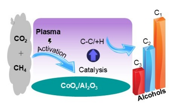 等离子体催化CO2/CH4生成醇类示意图