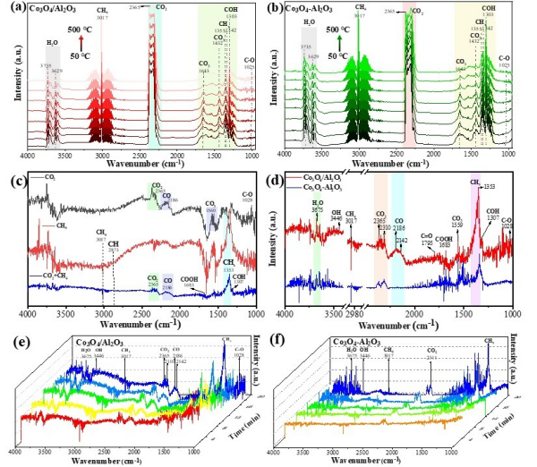 研究团队采用纳秒脉冲放电等离子体技术实现了CO2/CH4的精准活化,创新性设计了一种金属氧化物界面(CoOx/Al2O3)催化剂,可实现CO2/CH4的定向转化。通过等离子体参数优化与催化剂界面调控,研究发现等离子体与氧化物界面之间存在强协同效应,提升醇类化合物的选择性至37.2%。