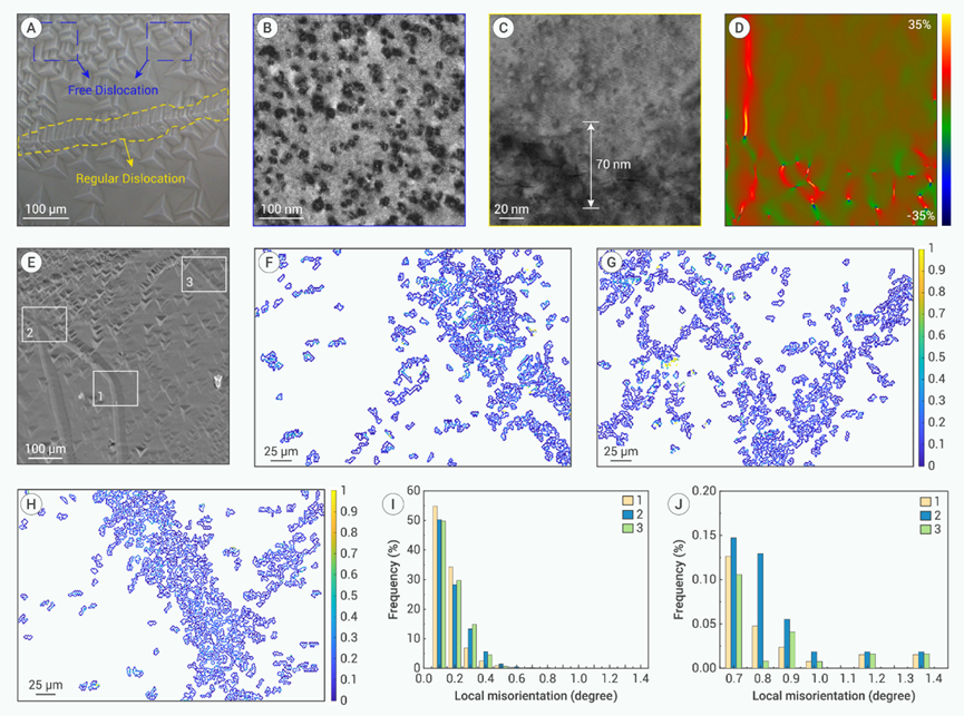 对此,无码影片 上海硅酸盐研究所研究员苏良碧和副研究员张博团队针对氟化钙晶体位错原子级表征技术瓶颈,构建了“化学腐蚀法-高分辨电子背散射衍射技术(HR-EBSD)-积分差分相位衬度扫描透射电子显微技术(iDPC-STEM)”多尺度联用表征体系。研究通过开发基于菊池线旋转补偿算法的高分辨EBSD技术,突破了传统EBSD精度不足的瓶颈,并结合化学腐蚀法,实现了晶体中“自由分布”与“规则聚集”两类位错精准定位与微小取向差表征。同时,研究采用超低剂量iDPC-STEM技术,首次在原子尺度直接解析了F/Ca原子排列,并清晰捕获位错真实构型。