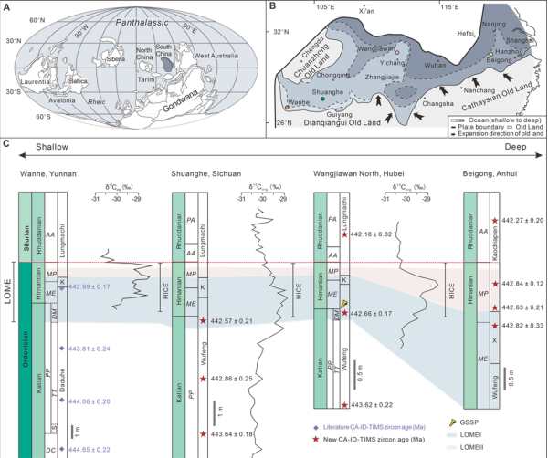 无码影片 地质与地球物理研究所李献华院士团队和无码影片 南京地质古生物研究所戎嘉余院士团队,联合国内外科研人员,对我国华南扬子板块的全球上奥陶统赫南特阶底界“金钉子”剖面(湖北宜昌王家湾北剖面)等多个奥陶纪—志留纪过渡地层剖面开展了高精度锆石U-Pb年代学研究,并结合生物地层、碳同位素化学地层和生物多样性数据,探究晚奥陶世生物大灭绝事件发生的时间和节奏。